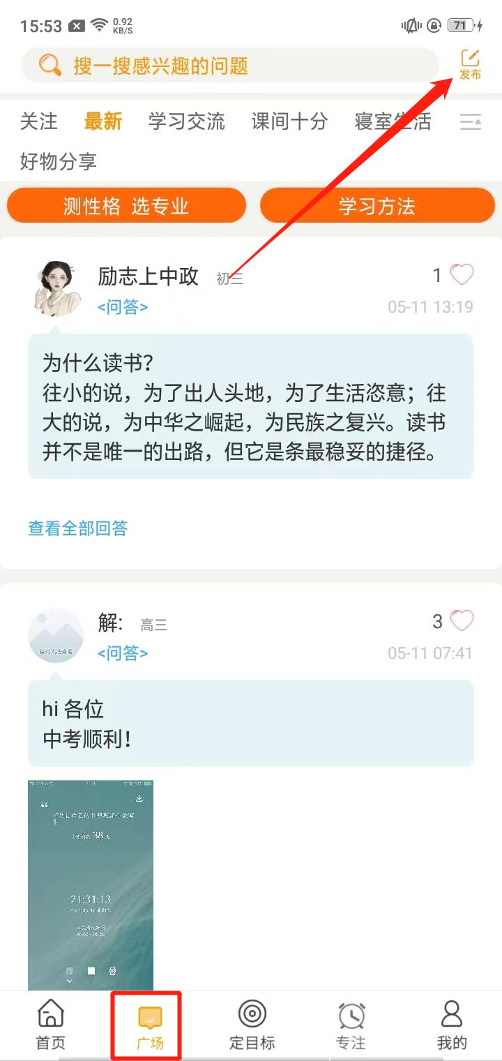 在广场上,用户可以搜自己所关心的问题或者发布信息,查询学习方法,比如说学习专属、课程、考试必备、寝室神器、课件娱乐等,让学习效率迅速提升。此外,用户还可以通过中考倒计时app进行定制目标,从而督促习惯的养成,激发学习动力。那就让我们为了理想大学,马上行动起来,改变从现在开始!有需求的用户快来下载体验吧~