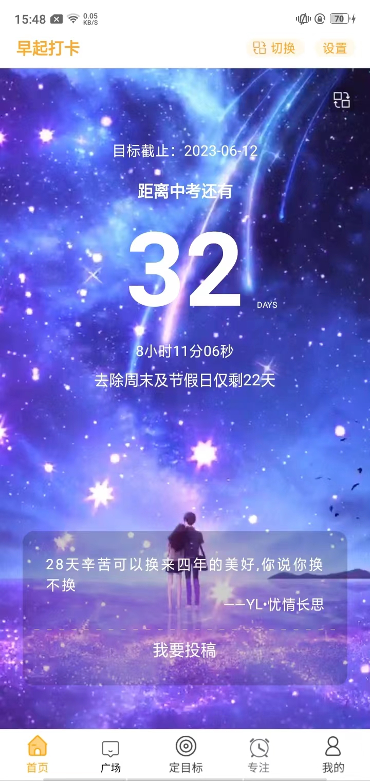 v5.41中考倒计时app是一款为广大学子提供学习管理的软件,软件界面简单容易上手,用户可在首页中更换背景壁纸,静态壁纸、动态壁纸或者从手机相册中上传照片,用户可以自行选择。还能设置距离中考或者高考等重大考试的时间,会计算去除周末以及节假日所剩余的天数,方便用户安排自己的学习计划。同时,在首页中,软件每天都会推荐一句格言,为枯燥压抑的学习增添一抹色彩。