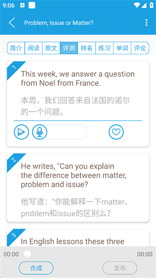记录你的声音、分享至评论、大声秀口语口语测评、句子得分显示、单词按键显示