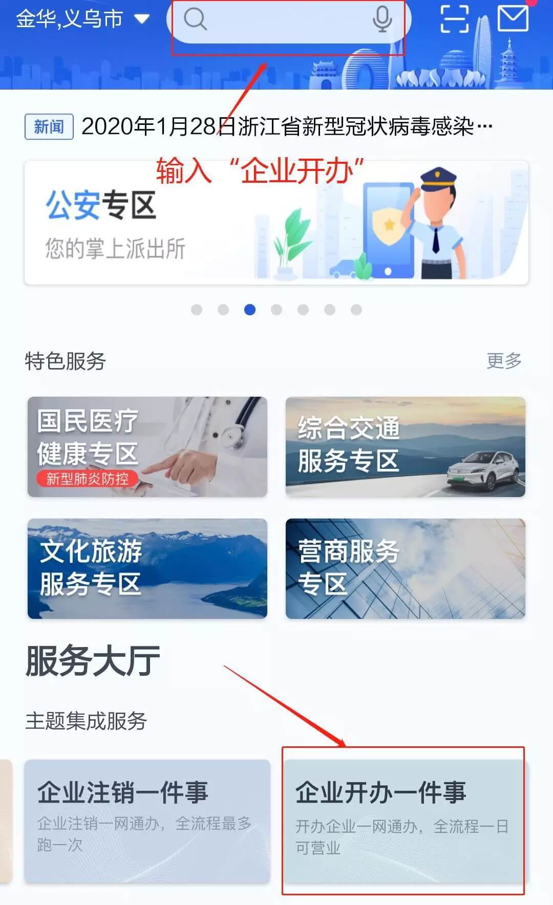 第 二 步 :点击首页中段“服务大厅”中的“主题集成服务”,向左滑动,找到“企业开办一件事”,或直接在首页搜索栏输入“企业开办”查找。