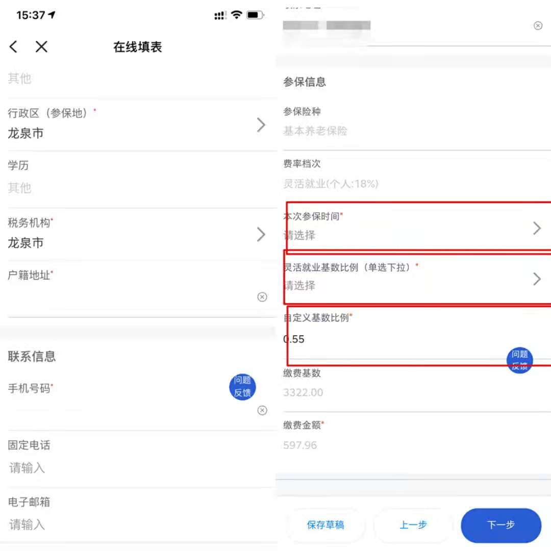 【灵活就业基数比例】:可在“保底、80%、100%、200%、封顶(300%)、自定义”中自行选择→自动出缴费基数、缴费金额→点击“下一步”。