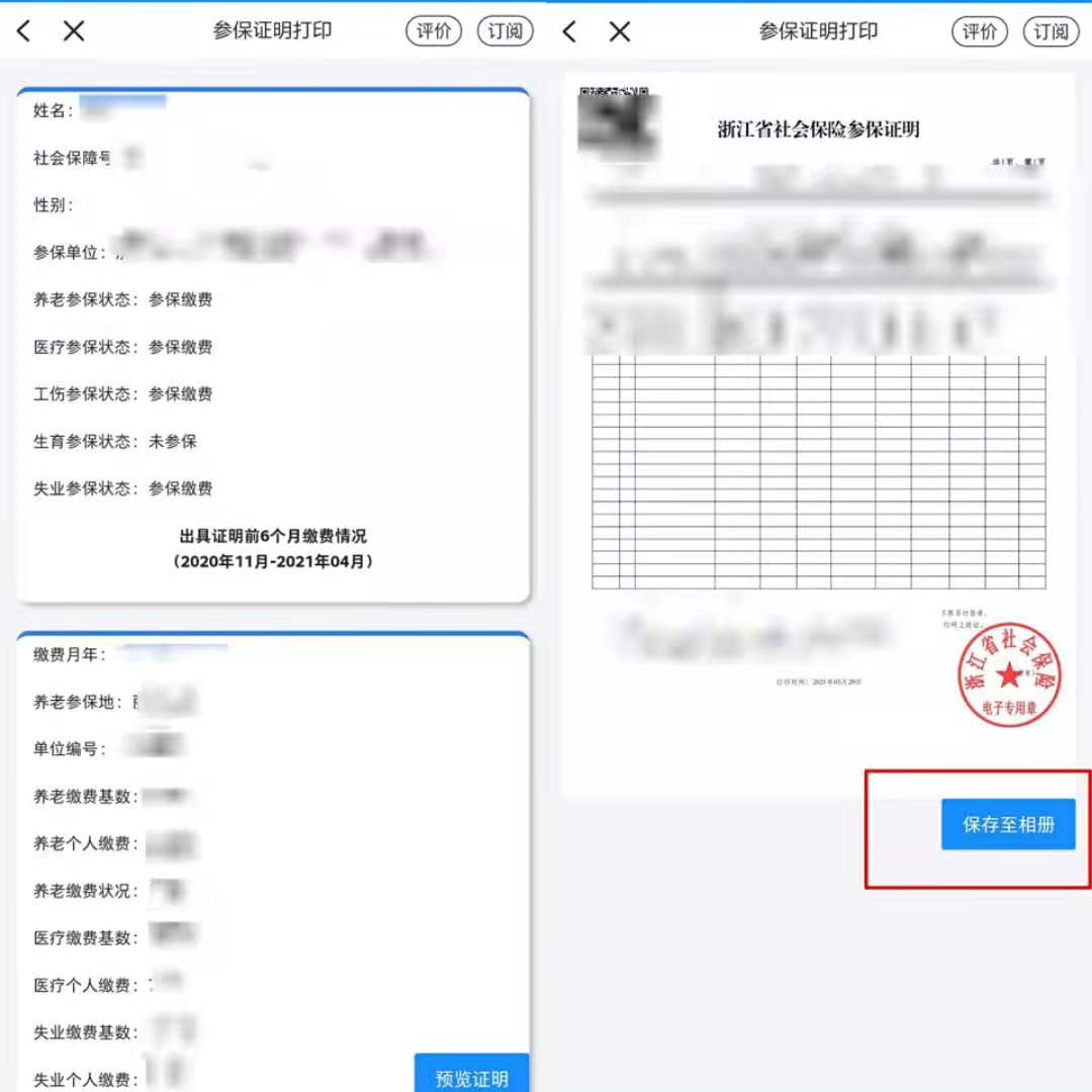 点击“预览证明”,显示社会保险参保证明后,点击“保存至相册”。