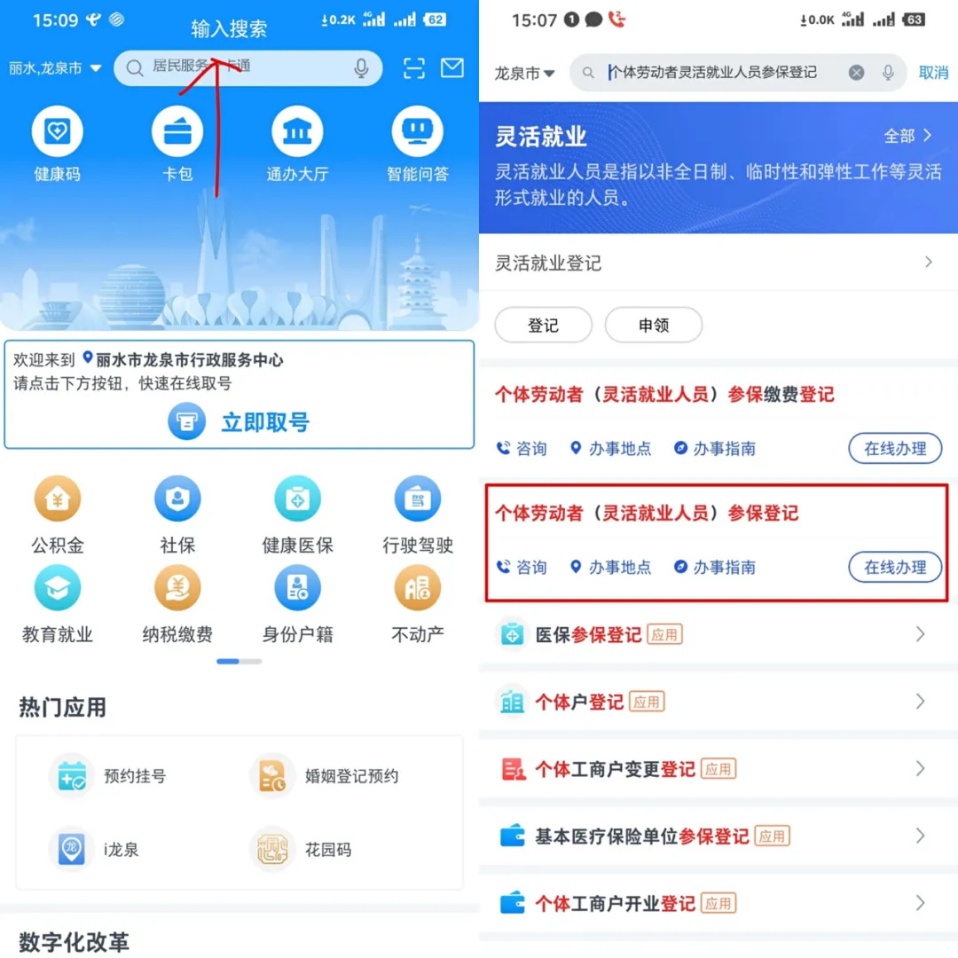 登录浙里办APP,定位到“您的所在地” → 点击搜索框,搜索关键字“个体劳动者(灵活就业人员)参保登记”