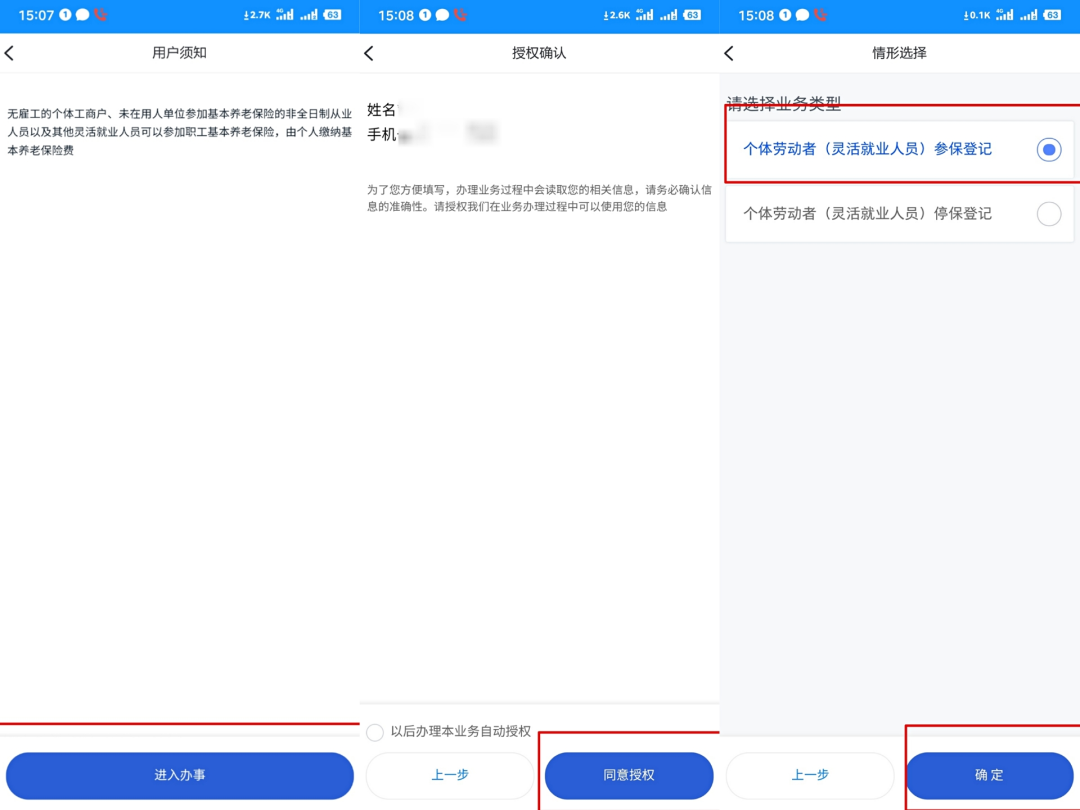 点击“个体劳动者(灵活就业人员)参保登记”下的 “在线办理”按钮,点击“进入办事”,选择需要办理的业务类型。