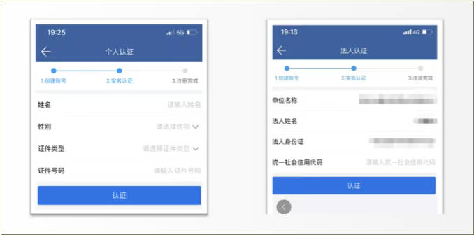 注册完成后需按照提示进行实名认证,以手机APP的界面为例,填写真实姓名、性别、有效证件信息完成认证。