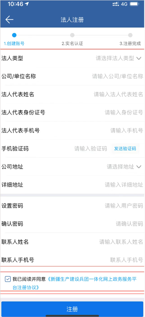 法人注册填写真实法人类型、公司/单位名称、法人代表姓名、法人代表身份证号、法人代表手机号、公司地址、详细地址等信息完成注册。