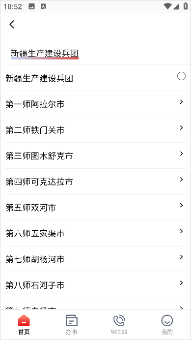 注册并完成实名认证后,登录进入App/PC端网页,首页点击 “新疆生产建设兵团”,根据需要办理业务或者查询业务的区域,选择不同的站点。