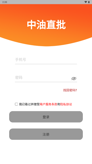 1、打开中油直批app最新版本,勾选协议后点击“注册”,