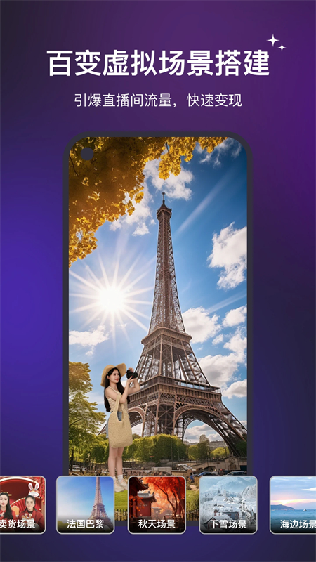 5、商品推广,活动宣传等直播必备场景,无需绿幕,轻轻一点即可使用替换您的背景。