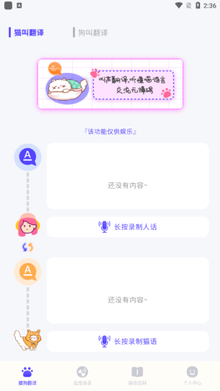 动物翻译器可以将人的声音转换为猫猫或者狗狗的叫声,也可以把猫言狗语转化为人话,从而实现人猫或者人狗的交流。