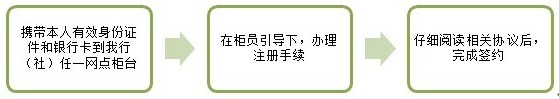 ③柜台签约注册:携带本人有效身份证件和银行卡到我行(社)任一网点柜台,由柜台为客户办理手机银行签约注册服务。