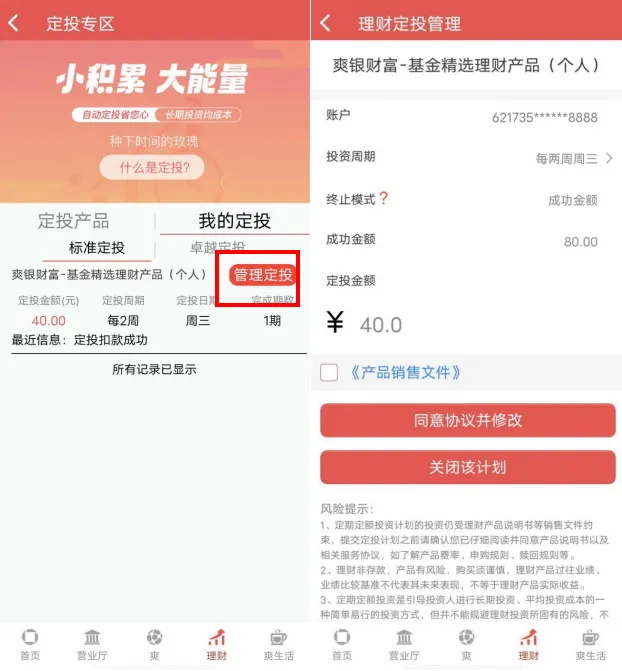 (1)选择“投资期数”,标准定投将在定投投资期数达到约定期数后自动关闭,投资期数包括投资成功期数和失败期数。