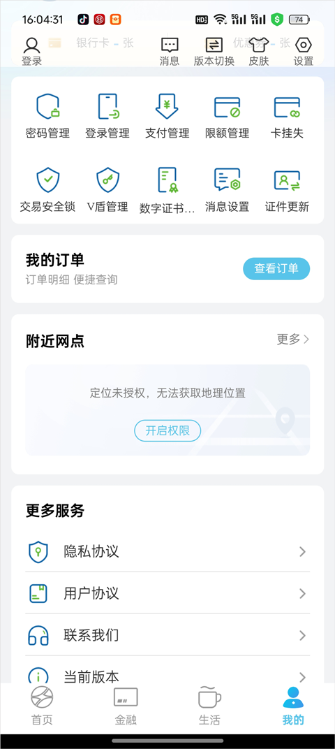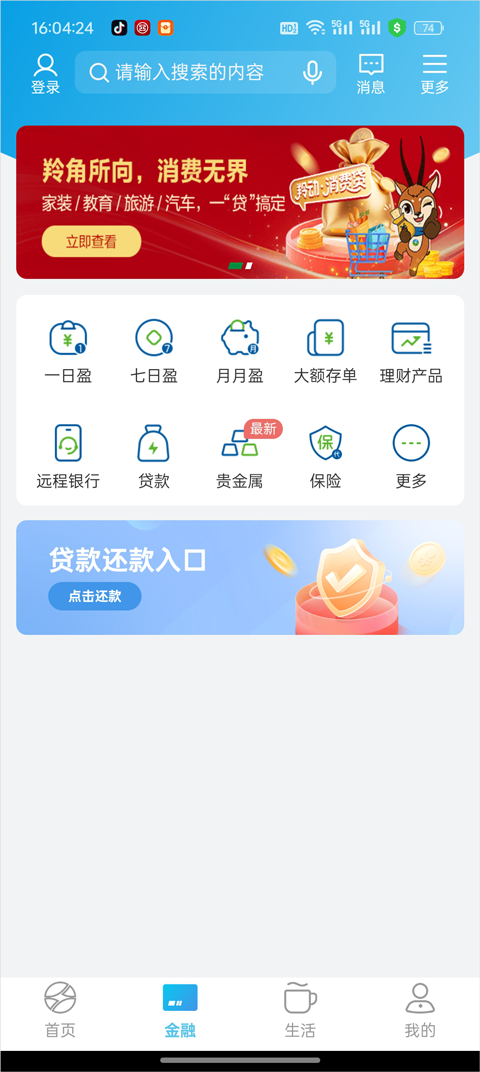 在“金融”板块中,用户可进行交易明细查看、贷款、购买保险理财查看、跨行转账等操作。