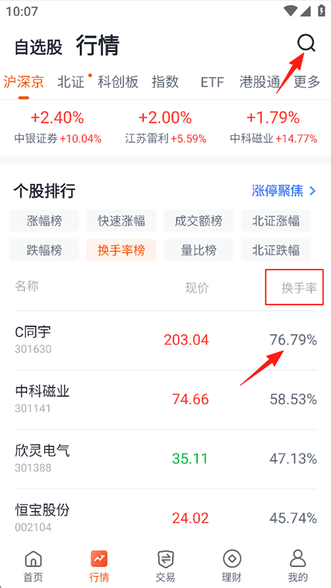 1、打开汇通启富APP,点击行情功能页,个股排行-换手率查看,或者点击右上角搜索;