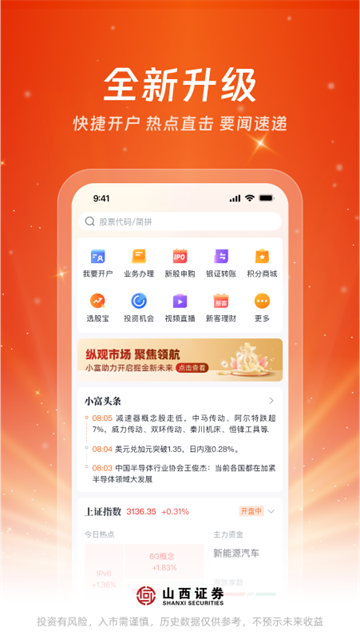 汇通启富App是山西证券推出的官方综合金融服务平台,旨在为投资者提供专业、安全、高效的互联网理财解决方案。汇通启富严格遵循"诚信、稳健、创新、高效"的经营理念,集成了股票行情、交易、理财、业务办理等核心功能,覆盖A股、港股通、科创板、国内期货、中金所期货、大宗商品、香港指数及基金等多类投资品种。