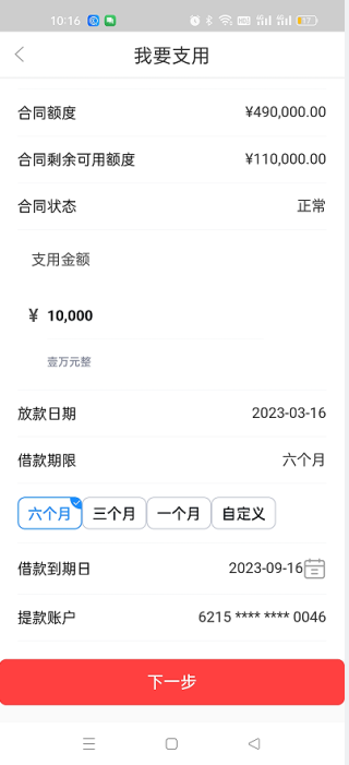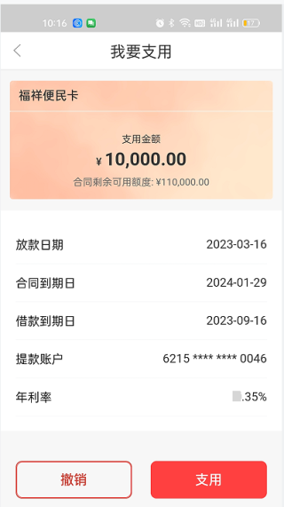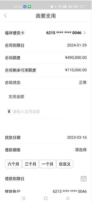 5.选择支用金额。选择借款期限(推荐选择1年,可以随时提前归还,提前归还不产生任何违约金,利息按实际使用天数计算)备注:图例期限没有1年的选项,是因为示范时笔者的便民卡合同不足1年。