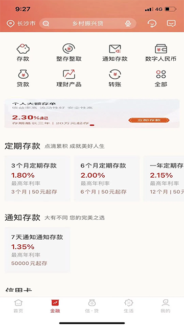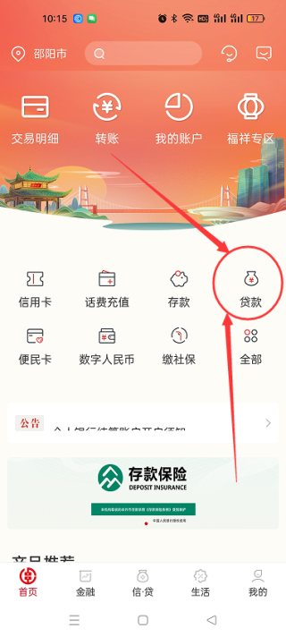 2.点击上图红色箭头指示的红色圆圈所标记的“贷款”。同理,存款等其他业务请选择对应图标。