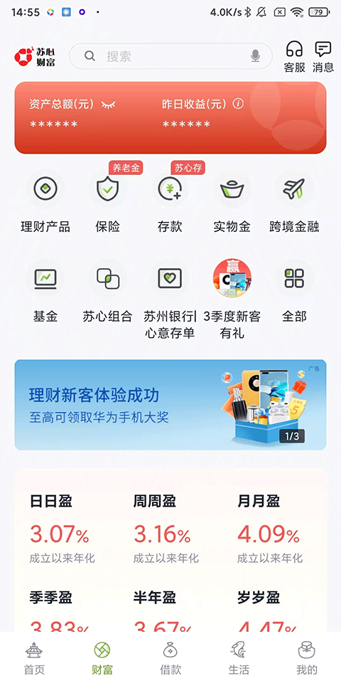 2、财富:理财产品、保险、基金等,资产总额、每日收益一键查看;