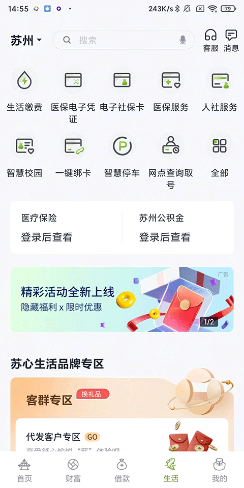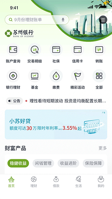 v7.2.6苏州银行App是一款以“绿色+健康+个性+专属+安全”为核心理念的新一代互联网移动手机银行客户端,集转账、投资理财、信用卡、借款等核心银行业务于一体,用户可随时随地通过手机办理,告别传统排队,大幅提升操作便捷性。其还整合了电影票、机票等生活服务功能,实现金融与生活场景的无缝衔接,为用户带来省时省力的综合体验。