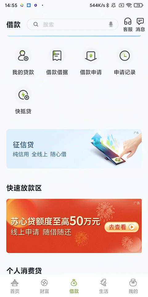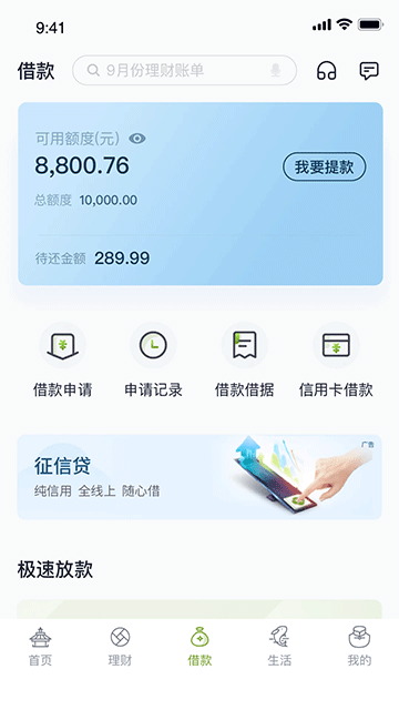 3、借款:我的贷款、借款借据、借款申请、申请记录和快抵贷等个人借贷服务;
