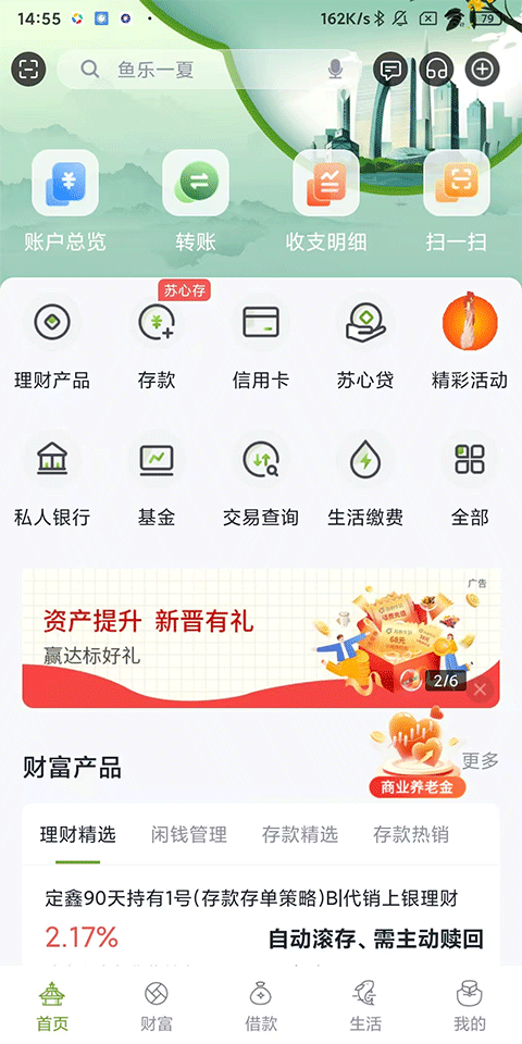 1、首页:提供账户总览、转账、收支明细及扫一扫五大常用快捷功能服务入口,还有理财产品、存款、信用卡、苏心贷等特色服务,点击全部可查看所有功能服务;