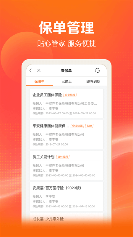 查保单:全面查阅保障情况,涵盖企业团体保单和个人家庭保单,投保人\\被保人都能查;一键下载电子保单、实时掌控账户变动,轻松玩转保单服务;