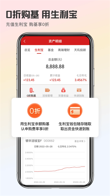 v7.6.12银华生利宝App是银华基金旗下投资理财平台,涵盖银华全部产品和服务,用户可以查询、交易基金产品,软件还有专业资产配置团队提供投资组合方案。用户将钱存入银华生利宝还可以享受货币基金的收益,申购基金时还可享受最低0手续费!有理财需求的朋友欢迎下载体验!