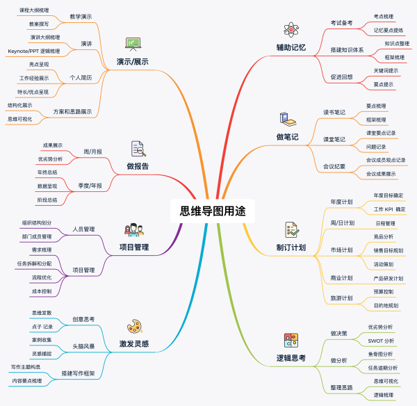 具体实现方法是用一个关键词去引发相关想法,再运用图文并重的技巧把各级主题的关系用相互隶属的层级表现出来,把关键词与图像、颜色等建立记忆连接,最终用一张放射性的图有重点、有逻辑地将所有内容表现出来。