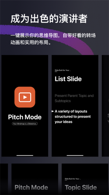•演说模式:一键排版布局&自动生成转场动画,让思维导图带来超越幻灯片的演示效果。