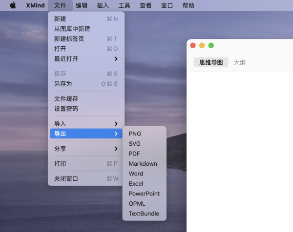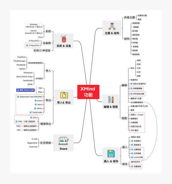 支持导出 PNG、PDF、文本、Excel、Word 等文件格式,也可以将导图用邮件、印象笔记等分享出去。