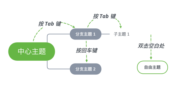 按 Tab 添加子主题,按回车键添加同级别主题,双击空白处添加自由主题。