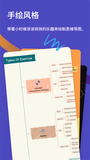 •手绘风格:一键即可将齐整的导图变成生动的手绘风格,为你的表达增添更多趣味。