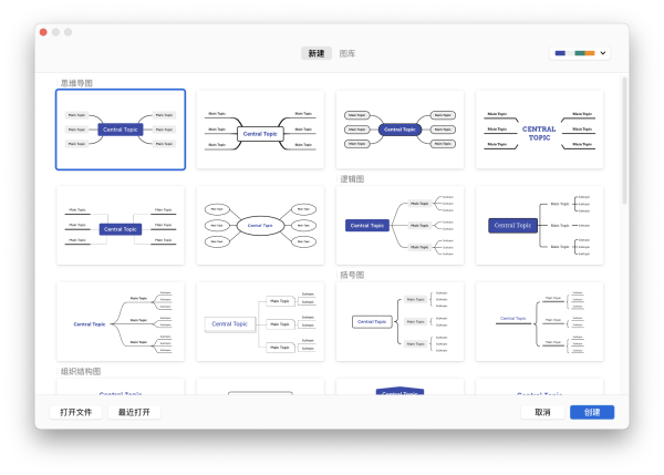 可以创建空白图,可以选择已有主题创建,也可以在图库里打开模板。