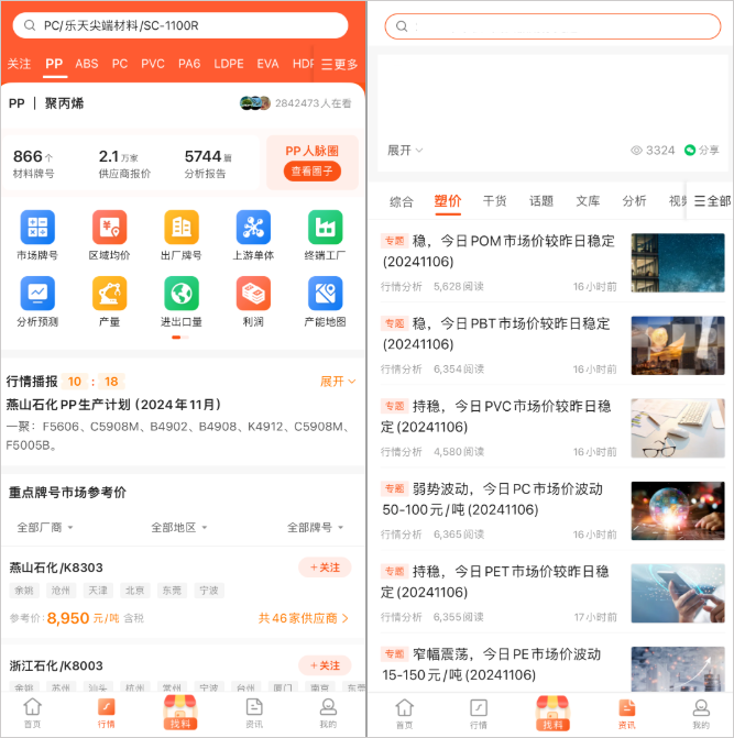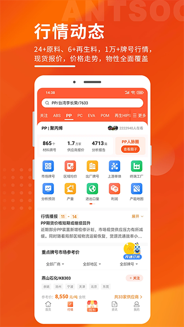 v6.3.5俺搜App是一款专为化塑行业打造的数据型工具软件,聚焦“材料行情+采购需求+客户对接”三大核心服务。平台每天更新20+品类、10000+塑料牌号的现货报价信息,覆盖全国40多个城市、400多家工厂,实时跟踪市场均价、出厂价、区域价格、开工率、库存量、利润等核心数据。无论是采购方还是供应方,都能通过俺搜快速掌握市场动向、筛选目标客户、寻找合适材料,极大提升效率和决策精准度。新版本俺搜App不仅提供丰富的数据参考,还建立了从询价到找客户的交易生态闭环,让化塑生意变得更轻松、更智能。