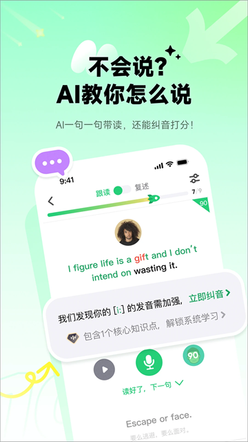 内置来自硅谷前沿语音识别技术,给你的英语口语实时打分,矫正发音。