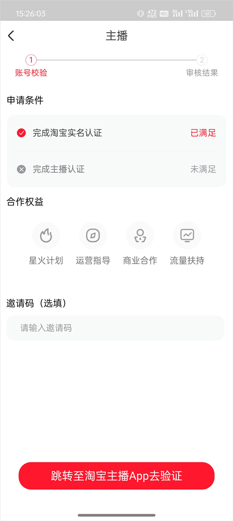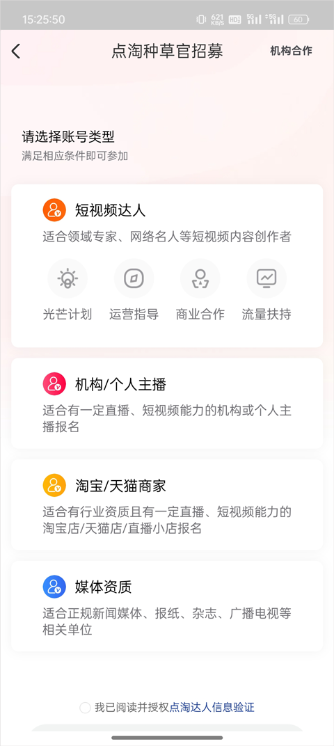 3、选择账号类型,满足相应条件即可参与,点击主播并加入,适合有一定短视频创作和直播能力的主播;