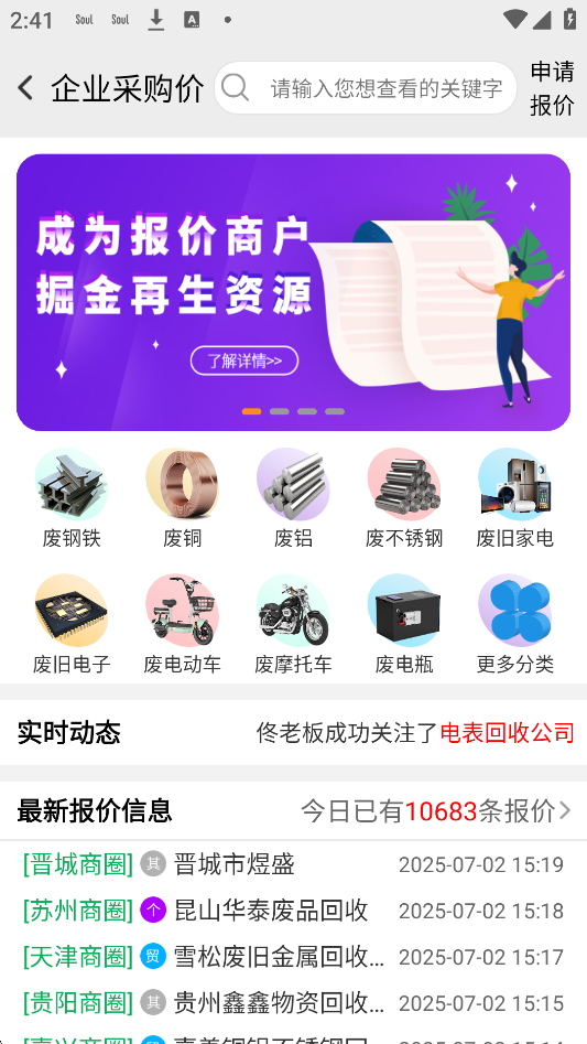 v5.3.2废废App是一个废旧金属及物品回收平台,涵盖全国32个省、50多个再生资源大品类,包括钢铁、有色金属、电子电器、塑料、纸、电缆、设备、再利用材等。软件通过大数据技术,汇聚了全国数万家再生能源企业,将资源整合起来,能够实时监控废旧金属的行情,与再生能源以及金属行业的工厂进行合作,让废旧金属变成有用的金属。废废App还会通过与各地交易平台进行对接,实时发布全国各地区的废金属价格,让用户掌握最新的一手资讯,有需要的朋友欢迎下载使用!