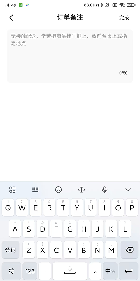 4、点击该选项后,在备注框中输入您需要留下的信息,例如对食品的要求、特殊口味、配送地址等,备注完成点击“完成”即可。