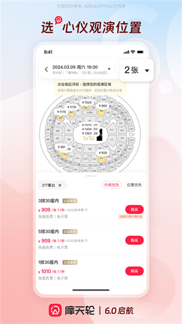 v6.54.0摩天轮票务网官方订票app是一款新一代演出赛事票务软件,涵盖演唱会、体育赛事、话剧歌剧、音乐会、儿童亲子、舞蹈芭蕾、展览休闲、曲艺杂谈等各种赛事演的票务订购服务,能够为解决用户在购买演出票、各种赛事票时遇到的价格不透明、买票难、买票贵等痛点。