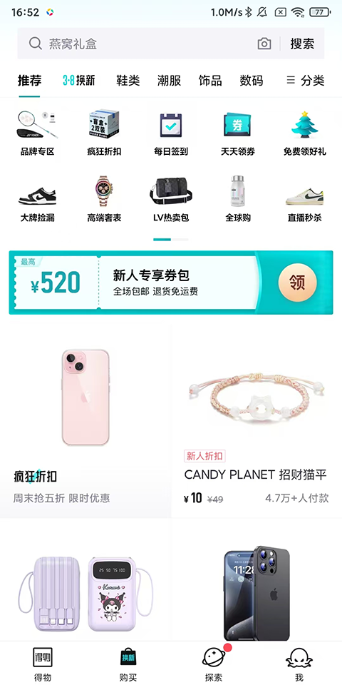v5.81.3得物App(原名“毒App”)是全球新一代潮流网购平台,集正品潮流装备、潮流商品鉴别、潮流生活社区于一体,励志为帮助年轻人了解球鞋文化和潮流资讯,以传统电商模式为基础,新增添加了“鉴别服务”,推出了"先鉴别,再发货"的购物流程,从而帮助用户减少购买到假货的几率,与Sneaker潮流文化逐步蔓延开的趋势大相径。知名品牌,明星入驻,虎扑大神亲自坐镇装备鉴定,1对1为你解决你关于运动、装备、潮流等诸多疑问。