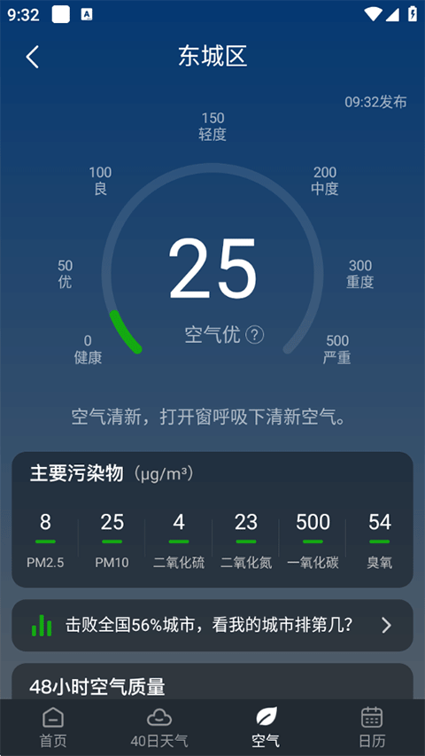 4、空气页面展示了详细的空气指标,让您更加了解您所在位置的空气质量;