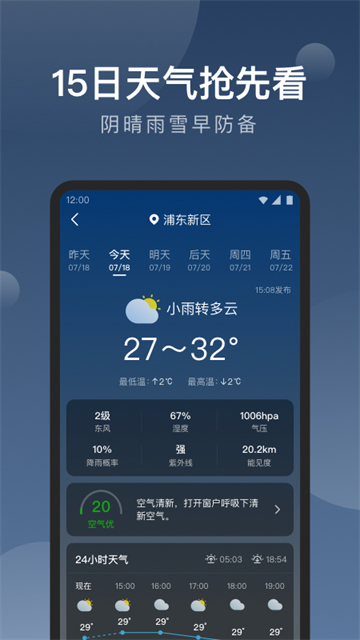 2、下拉显示24小时详细天气与15日天气预测,下方还有生活温馨小提示;