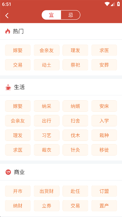 2、传统老黄历:提供传统的老黄历查询,提供择吉日待功能,可查询当日宜忌、时辰宜忌等等,是您为嫁娶、乔迁、开业等重大节日选择吉祥日子的好帮手。