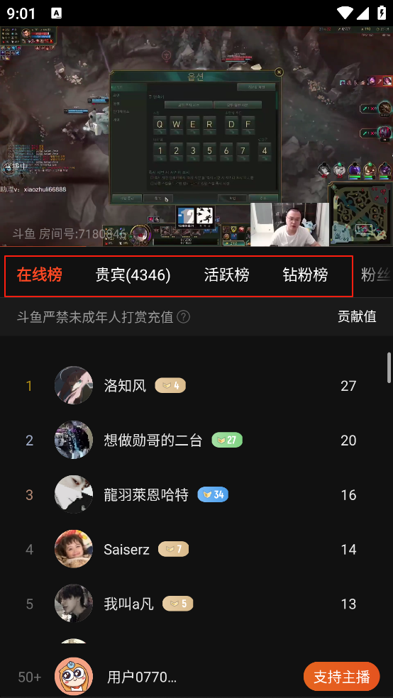 3、然后会弹出各种榜单界面,【在线榜】会根据用户的贡献值来排序