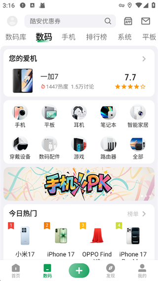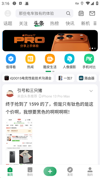 呈现数码相关头条内容、推荐动态及各类功能入口