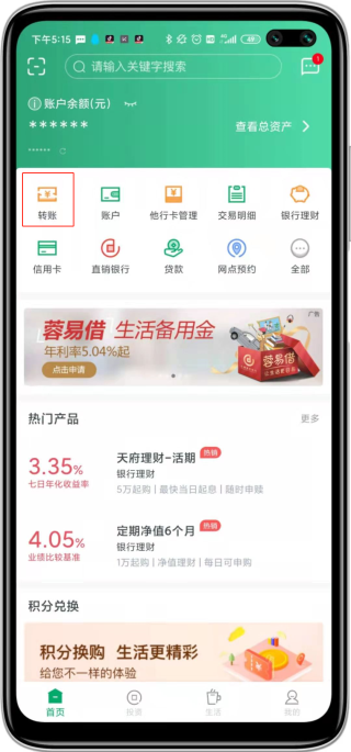1. 打开成都农商银行手机银行App,在首页选择“转账”,再点击“手机号转账”