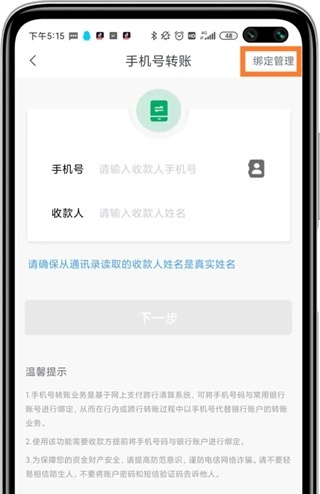 2. 进入“手机号转账”功能后,点击右上角“绑定管理”开始签约