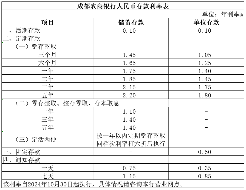 2025成都农商银行人民币存款利率表