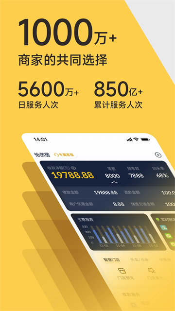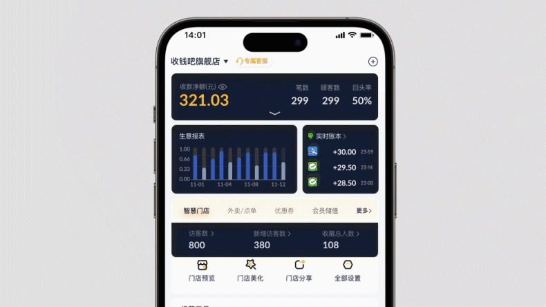 同时,软件能根据商家所使用的数字化产品特性及行业特征,智能展示专属数据。使用建议收款设备的商家,将能直观看到收款相关数据;使用收银系统的商家,APP则会呈现营业额、商品、订单等营业数据。
