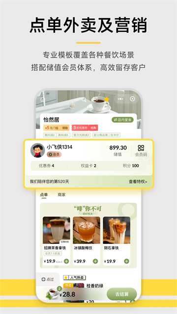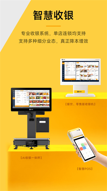 - 全行业一站式解决方案:顾客自助点单、外卖、微信小店、收银系统、会员营销,多款生意工具助您提高营收和效率。